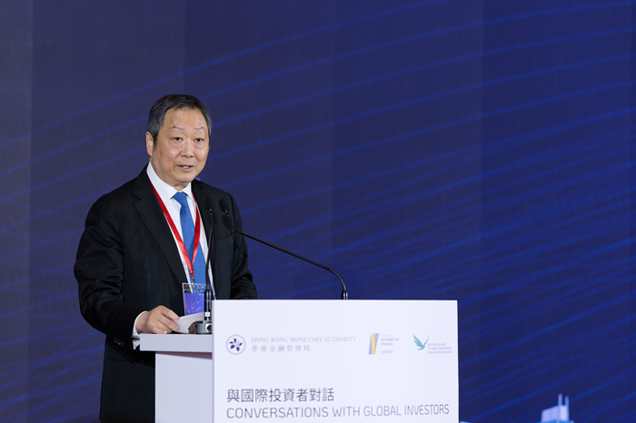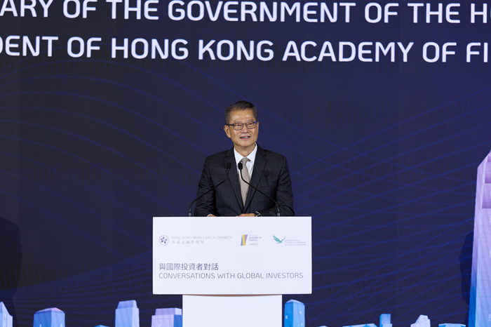 Mr Paul Chan, Financial Secretary of the Government of the Hong Kong SAR and Honorary President of Hong Kong Academy of Finance, delivers a keynote speech at the “Conversations with Global Investors” investment forum.