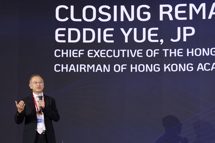 Mr Eddie Yue, Chief Executive of the Hong Kong Monetary Authority and Chairman of the Hong Kong Academy of Finance, delivers closing remarks at the “Conversations with Global Investors” investment forum.