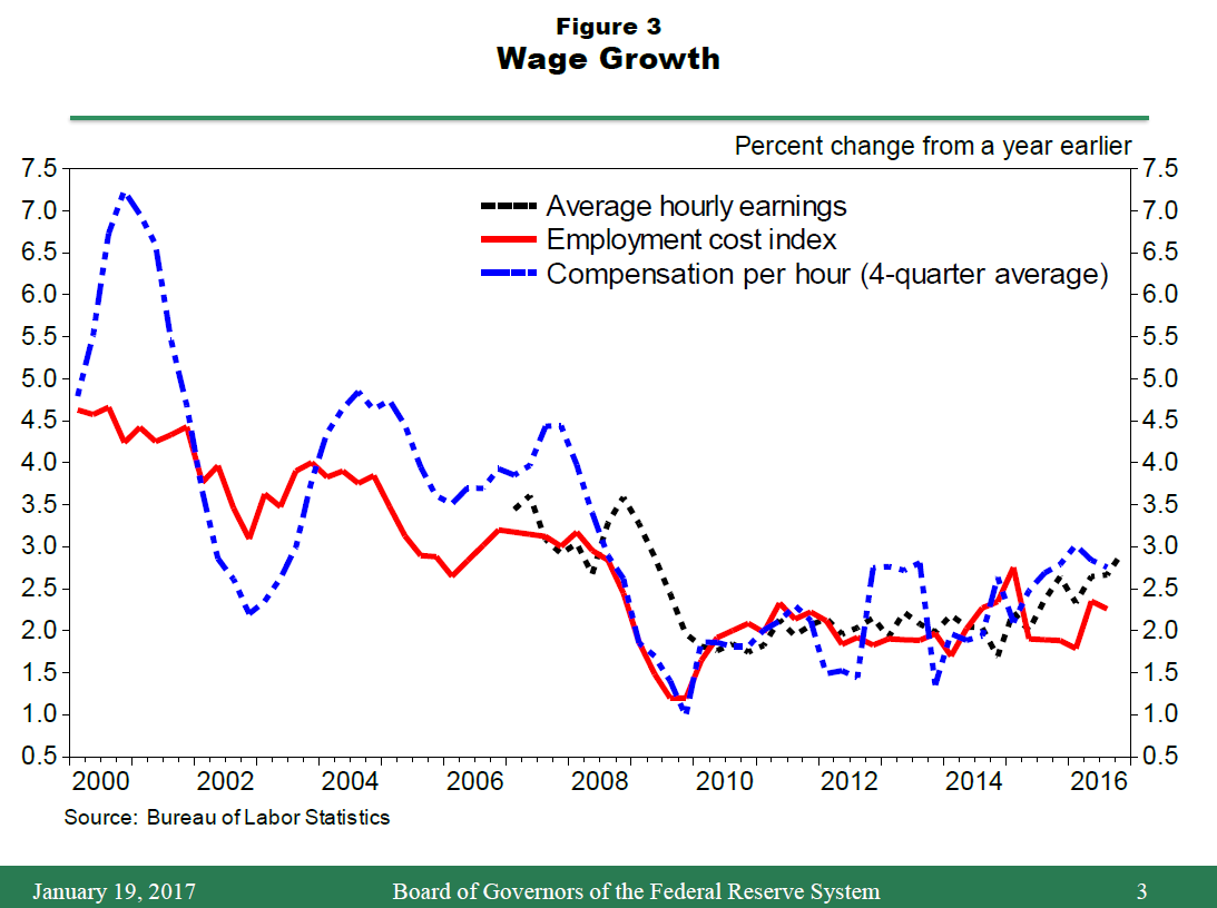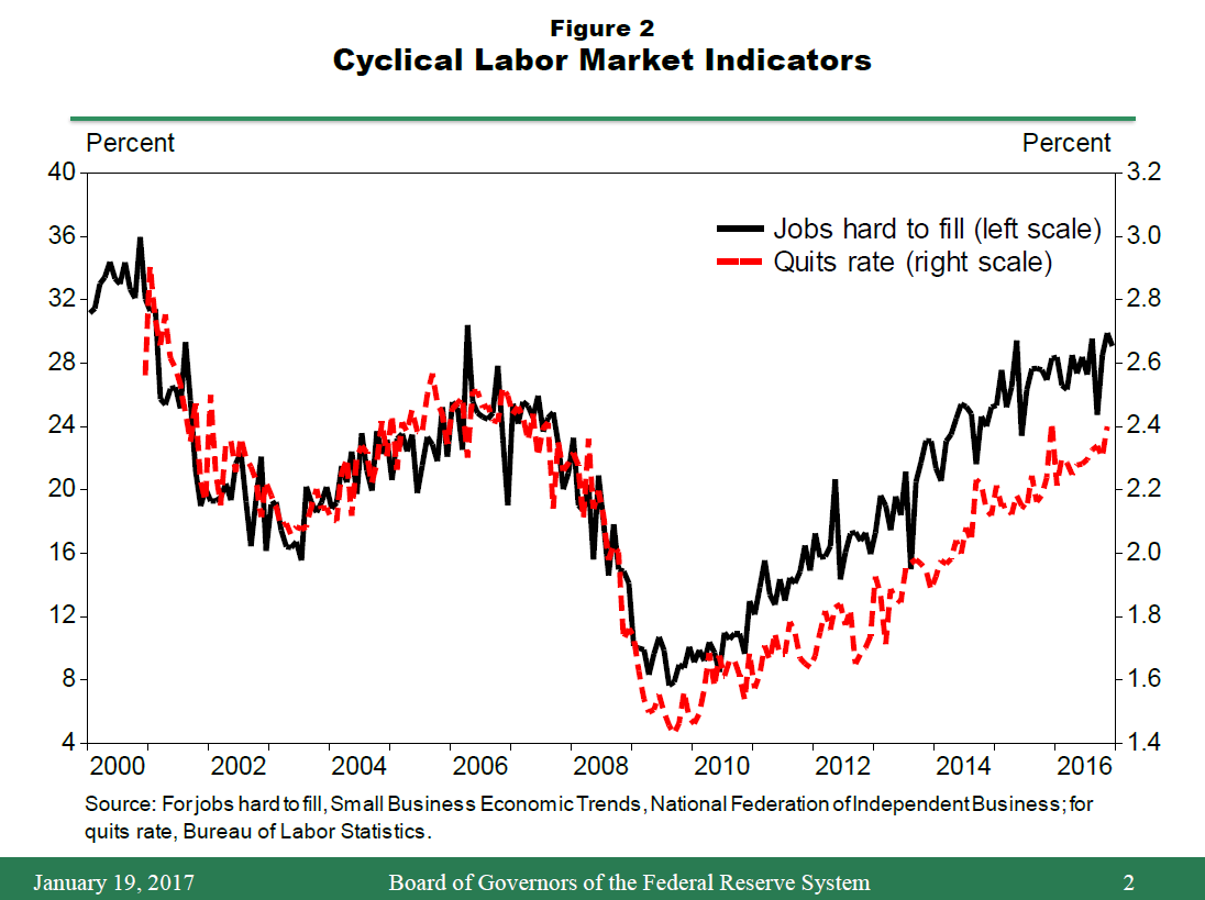 7. Many other labor market indicators also improved more slowly in 2016 relative to the pace seen in the prior two years, including the U-6 measure of labor utilization, the rates of job openings, hiring and quits, survey readings on net hiring plans and the difficulty of filling vacancies, and the average duration of unemployment. A notable exception to this general pattern is the labor force participation rate, which declined fairly steadily from 2007 through 2015 but then flattened out last year despite continuing downward pressure from the aging of the population and other factors. However, improvements in labor market conditions along this dimension arguably reflect an increase in potential output, and so they are probably not a source of inflationary pressures.