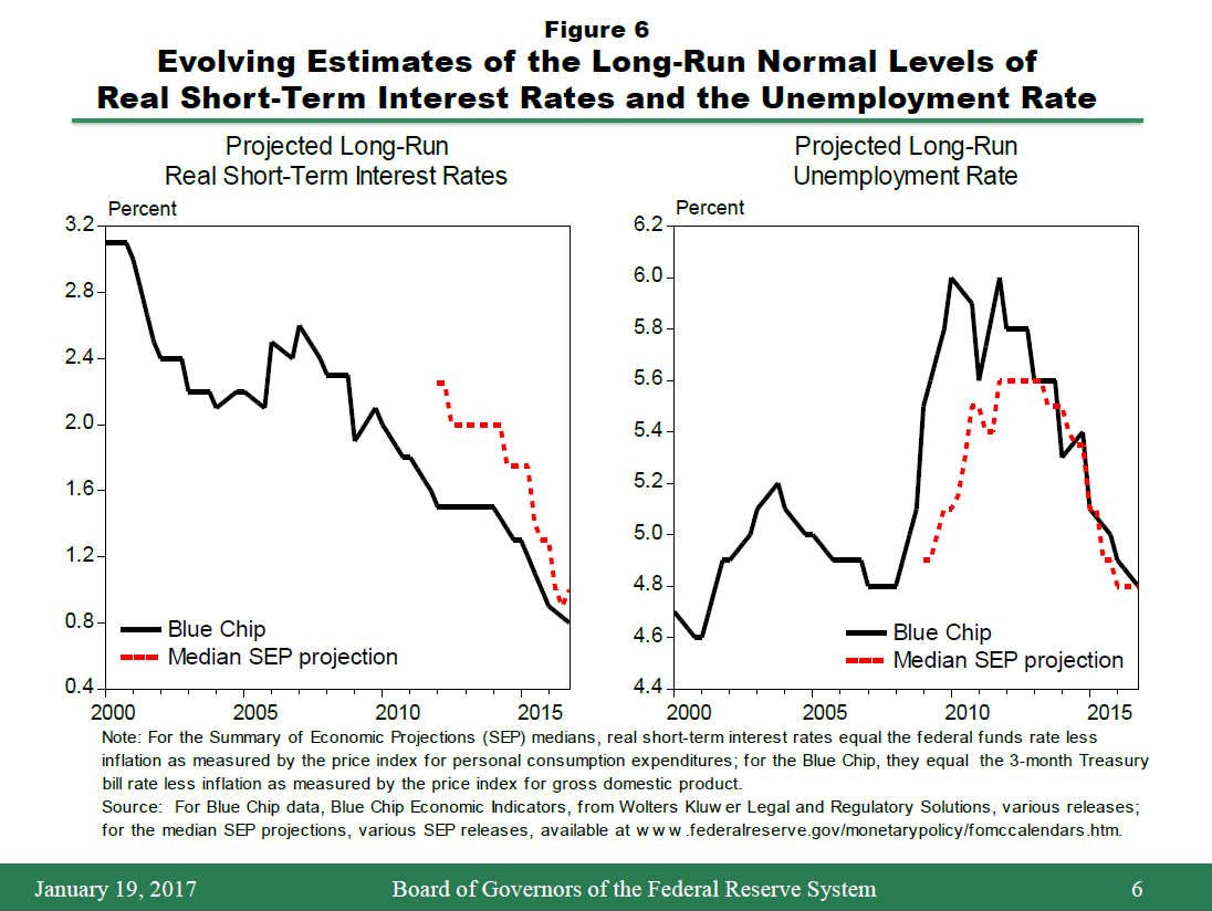 One important factor explaining this divergence is the FOMC's growing recognition that the longer-run neutral level of the real federal funds rate has likely declined below 2 percent, contrary to what is often assumed in implementations of the Taylor rule. As illustrated by the left-hand panel of figure 6, since 2000, both FOMC participants and respondents to the Blue Chip survey have markedly reduced their projections of the level of real short-term interest rates expected to prevail in the longer run. Presumably, these revisions were made in response to accumulating evidence that lower real interest rates than those seen on average in the past would be needed permanently to keep the economy operating on an even keel. In addition, the right-hand panel shows considerable changes over time in estimates of the normal longer-run rate of unemployment, with corresponding implications for estimates of the economy's productive potential and the output gap. Such revisions would imply shifts in the level of the Taylor rule's prescriptions by as much as 1-1/4 percentage points, holding other factors constant.14 Clearly, sensible implementation of policy rules requires adjustments to take such changes into account, as a failure to do so would result in poor monetary policy decisions and poor economic outcomes.15