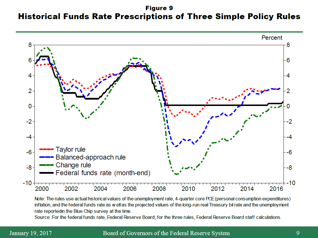 20. The change rule is , where R is the federal funds rate, p is four-quarter rate of core PCE inflation, U* is the projected longer-run unemployment rate, and U is the current unemployment rate. In computing the prescriptions for the change rule shown in figure 8, the midpoint of the target range for the federal funds rate prior to the December 2016 FOMC meeting, 0.38 percent, is used as the starting point. For a discussion of this rule (and of policy rules in general), see Taylor and Williams (2010).